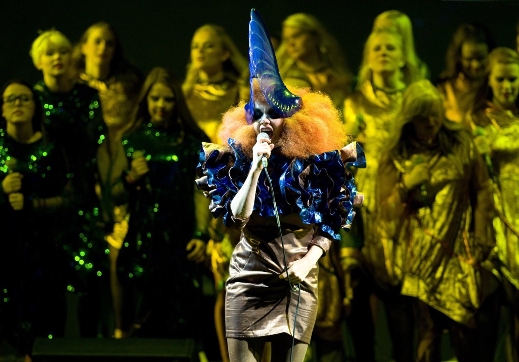 Flanked by a 25-piece Icelandic women’s choir, customised organs and some other-worldly pendulum instrument, she’s in a shimmery dress with wings, with a metallic blue bishop’s mitre headpiece on top of a bright orange afro wig. So far, so Bjork. The first half hour or so is a floaty Biophilia showcase, with the sombre keys and glitchy sparkles of Thunderbolt making way for the scattery breakbeats of Crystalline and Moon’s delicate plinking. It’s a gamble – Biophilia hasn’t been released yet, and even at this stage Bjork considers it a work in progress, having last week postponed its release date until October 7, to rework the material. Her three-week summer Biophilia residency in Manchester had the performers playing ‘in the round’, with the audience never more than a few metres away, so the impact is slightly lost in the field’s expanse. The big screens show pre-recorded videos of nebulae, fractals and atomic structures, so if you’re at the back of the field you’ll see Bjork as a tiny orange and blue sprite. Patience is a virtue though – Hidden Place, from 2001’s Vespertine, is lifted to even greater transcendental heights on the wings of the choir, while One Day, Joga and Hyperballad will be tattooed on our brains for a long time yet.