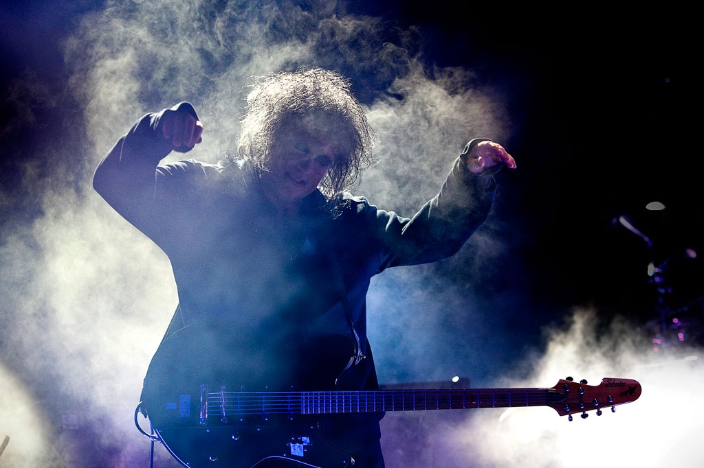 And then there’s The Cure (above), the clincher for many people’s ticket at Bestival, playing their only festival show this year. After a self-indulgent Oxegen show in 2004 when they played for about seven hours and had to be dragged off and earned a fine for their troubles, Saturday’s three-hour set could well be a streamlined show from everyone’s favourite goth-rock-pop-whatever heroes. Frontman Robert Smith’s jet black candy floss hair and slathered-on lipstick is losing a battle with the elements, but we even catch him smiling a few times — especially when he produces a custom-made Bestival cartoon guitar “that weighs as much as a car”. With 30-odd years of classics, everyone has a favourite Cure song, one that reminds them of some teenage disco, or a mixtape from years back. They play them all, in a euphoric 30-song set – from the New Order synth blasts of The Walk and Let’s Go To Bed, to the jangly fey pop of Just Like Heaven and Friday I’m In Love — even though Smith apologises for it being the wrong day. Strangers are hugged, hands are held, and there’s some mass feline prowling for Love Cats. The Cure: Bestival 2011 could well be a future No. 1 album, or at least a bootleg hit in the blogosphere. There isn’t a dry eye in the house, although that could be because it’s pissing rain by now.