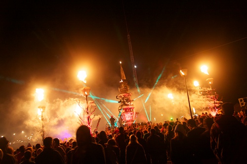 It’s becoming a bit of a pattern at this stage, but we’re on the hunt for more early hours rave bleeps and we join the swarms on the way to the Arcadia Afterburner (above) for another blast of SL2 – this time in full fired-up gas mask crazy-ass MC mode. The rain isn’t doing any damage to the 50ft flames and Mad Max steam punk rave tower. The MC is roaring “fuck the rain, we still got electricity”, as Slipmatt doles out unashamed throwbacks while everyone swings rain ponchos round their heads. The Prodigy’s No Good, (Start the Dance), Out of Space, Black Box’s Ride on Time and some skanking dub top off another auto-pilot dance-off, before they pull the plug. We lie back on the grass to get our bearings while a girl walks past in a fancy dress Bjork swan gown — and we remember tomorrow could well be even more special.