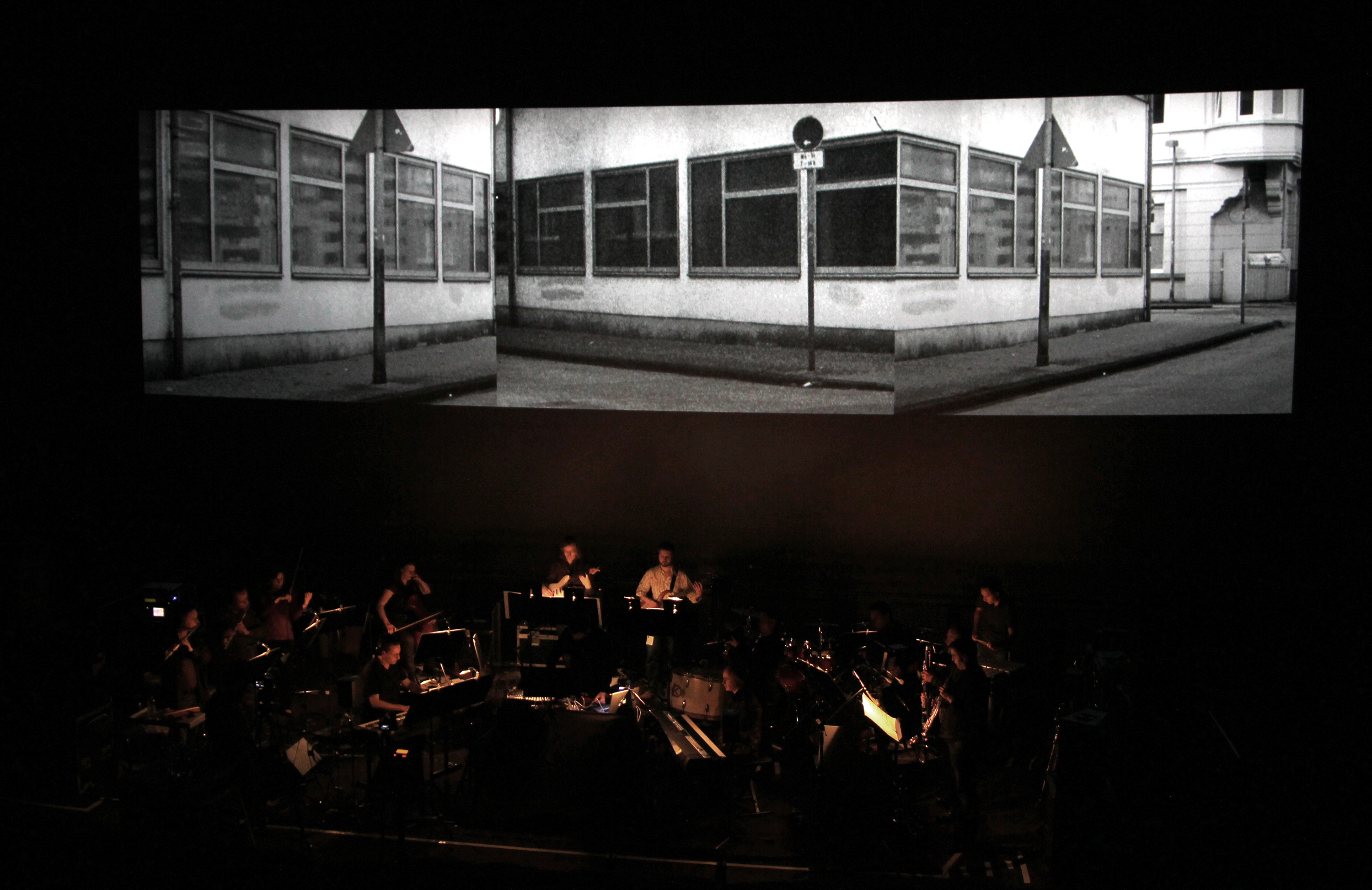 Free of Ralf Hutter’s dry wit and prophetic lyrics, Icebreaker’s performance has a more abstract slant, synchronised with a film in triptych arrangement by Sophie Clements and Toby Cornish. Shot in grainy monochrome in Kraftwerk’s native Ruhrgebeit region, the film darts between knife blade close-ups, chrome door handles, traffic signs, power station chimneys and clean geometric shapes – triangles, circles and diagonal lines pointing to the Russian suprematist aesthetic on the iconic Man Machine artwork. In ambient phases during Mitternacht and Megaherz these visual hard lines soften, with flute motifs the soundtrack to raindrop ripples and branches stirring in the foreground of industrial estates. During Autobahn the film shifts focus from the journey to the road itself, as tarmac and broken white lines steer the piece into a much higher gear than the sedate 1974 homage to the utilitarian driving experience.