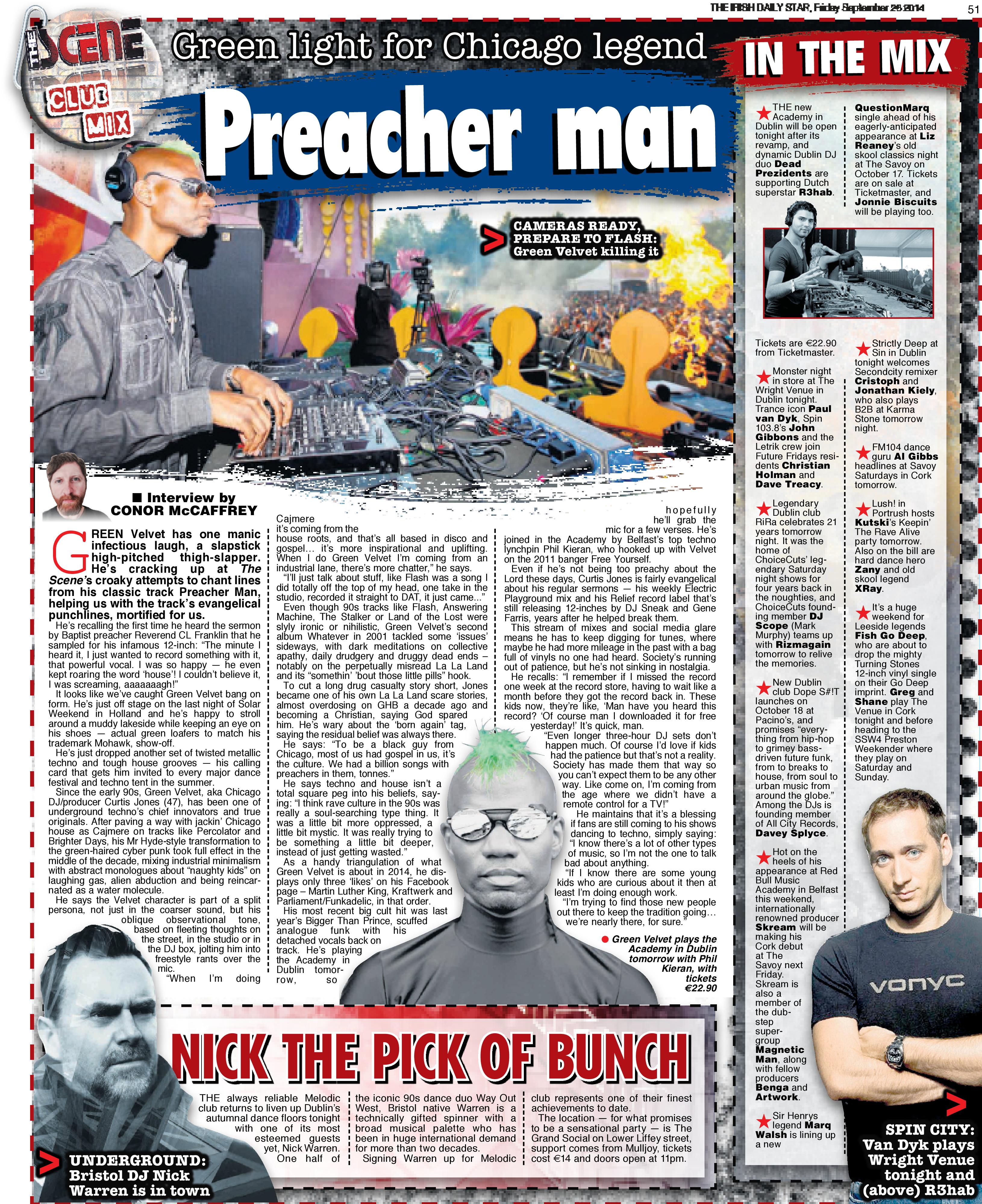 Green Velvet has one manic infectious laugh, a slapstick high-pitched thigh-slapper. He’s cracking up at my croaky attempts to chant lines from his classic track Preacher Man, helping out with the track’s evangelical punchlines, mortified for me.