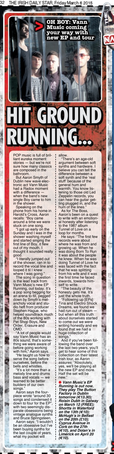POP music is full of brilliant eureka moment stories — but we’re not sure how many classics are composed in the bathroom. But Aaron Smyth of Dublin new wave electronic act Vann Music had a Radox moment with a difference — when the band’s new single Boy came to him in the shower.