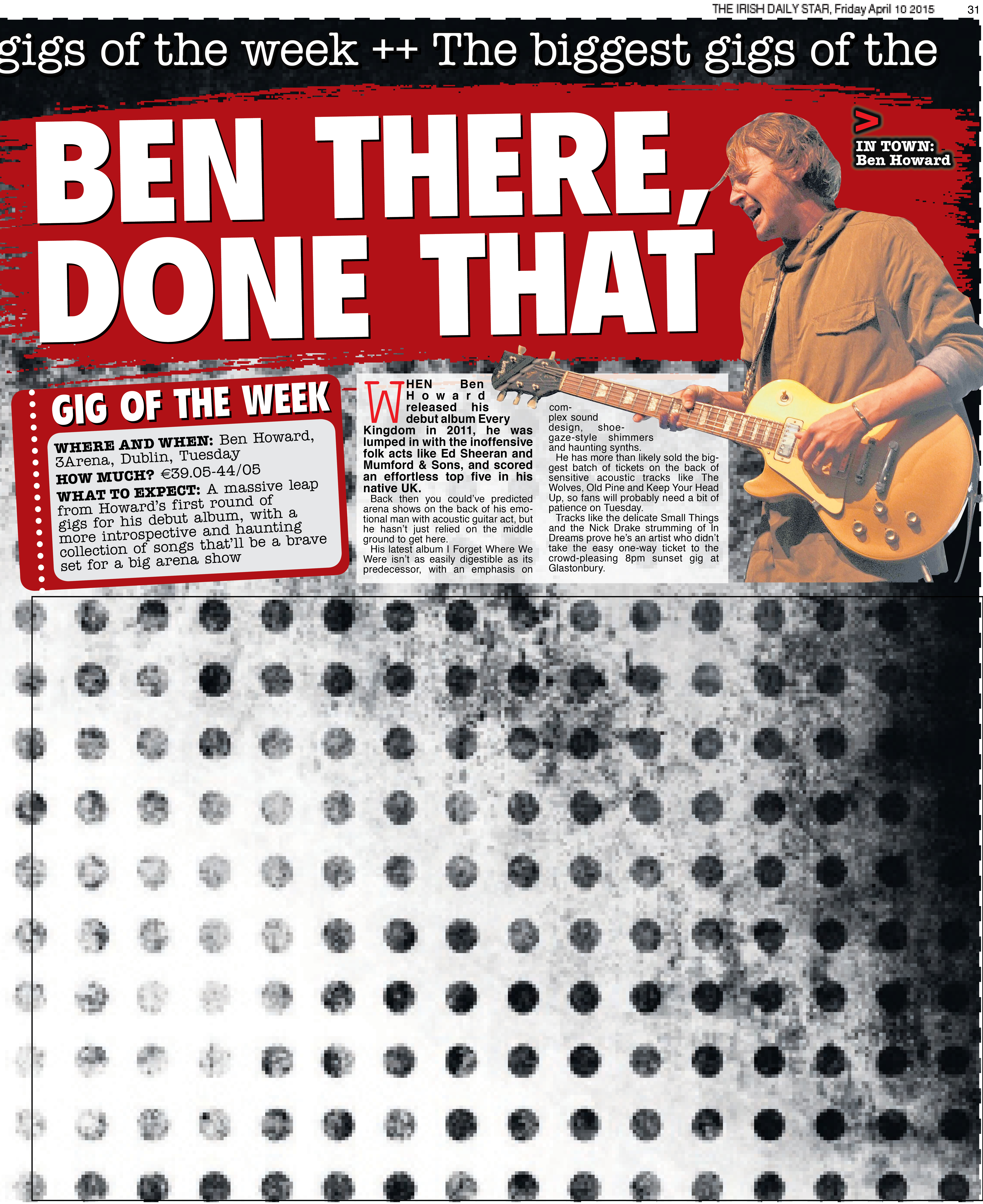 WHEN Ben Howard released his debut album Every Kingdom in 2011, he was lumped in with the inoffensive folk acts like Ed Sheeran and Mumford & Sons, and scored an effortless top five in his native UK. Back then you could’ve predicted arena shows on the back of his emotional man with acoustic guitar act, but he hasn’t just relied on the middle ground to get here.