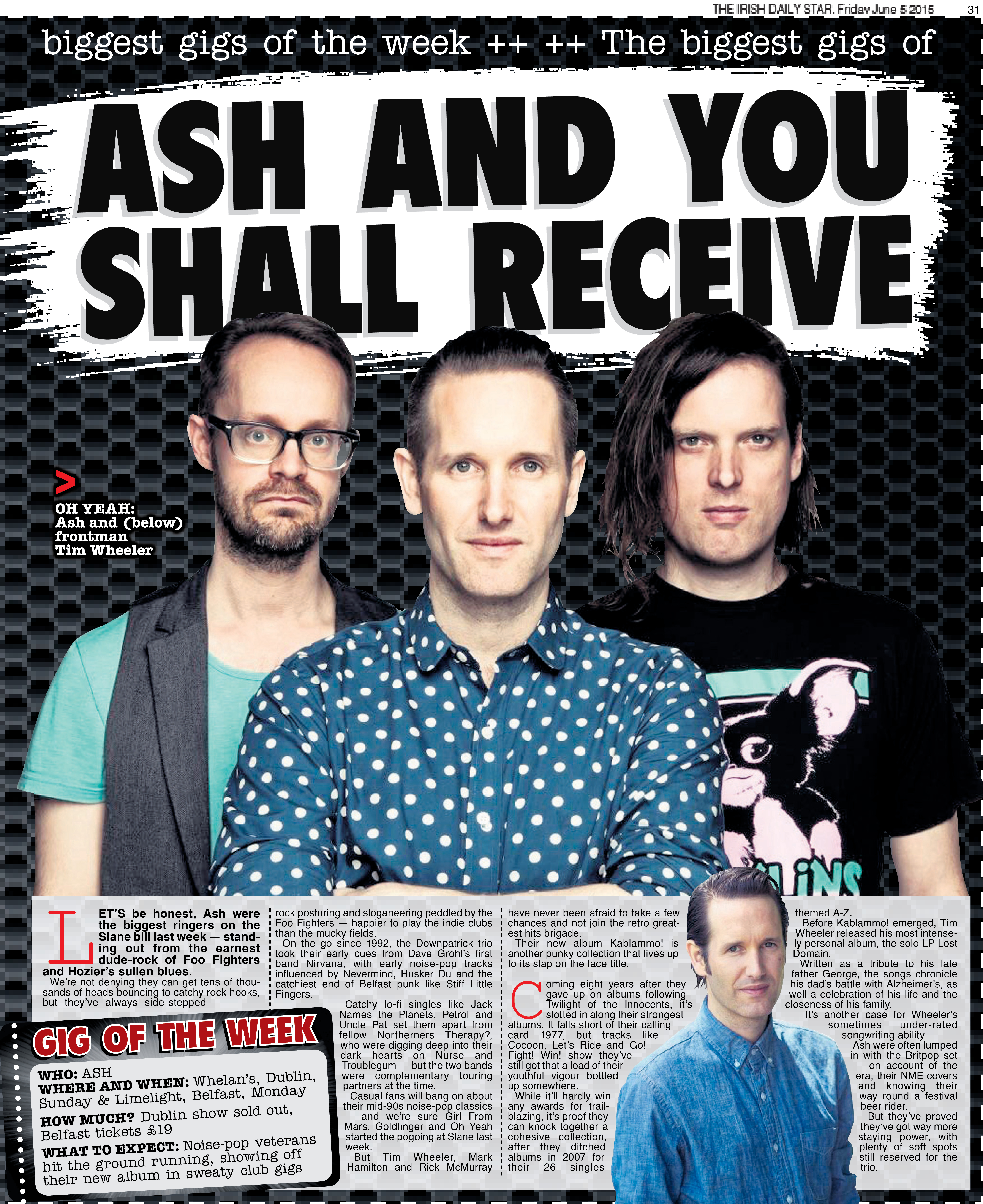 LET’S be honest, Ash were the biggest ringers on the Slane bill last week — standing out from the earnest dude-rock of Foo Fighters and Hozier’s sullen blues. We’re not denying they can get tens of thousands of heads bouncing to catchy rock hooks, but they’ve always side-stepped rock posturing and sloganeering peddled by the Foo Fighters — happier to play the indie clubs than the mucky fields.