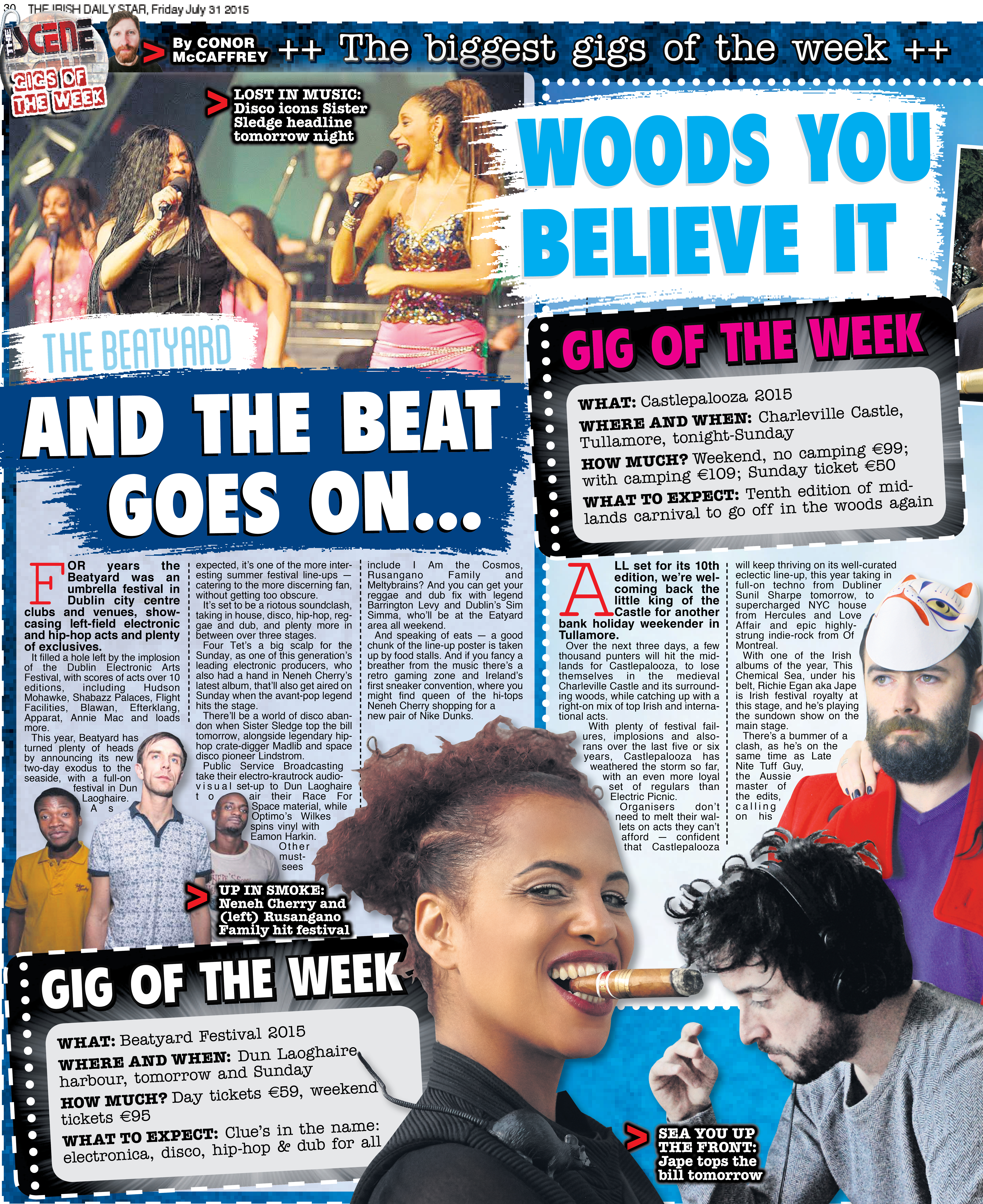 There’ll be a world of disco abandon when Sister Sledge top the bill tomorrow, alongside legendary hip-hop crate-digger Madlib and space disco pioneer Lindstrom. Public Service Broadcasting take their electro-krautrock audiovisual set-up to Dun Laoghaire to air their Race For Space material, while Optimo’s Wilkes spins vinyl with Eamon Harkin.