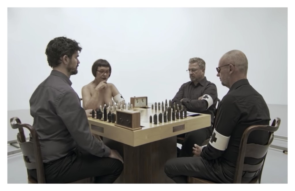 Laibach’s version is a collaboration with Croatian performance artist Vlasta Delimar, recorded during an installation Chess Game for Four in Zagreb, with the conceit here being that the game – also featuring Laibach’s Milan Fras, Luka Jamnik and Ivan Novak – is timed for four minutes and 33 seconds. The only Laibach signifier is the famous cross armband – in Delimar’s case the only ‘clothes’ she’s wearing. Milan Fras even goes without his famous headpiece.