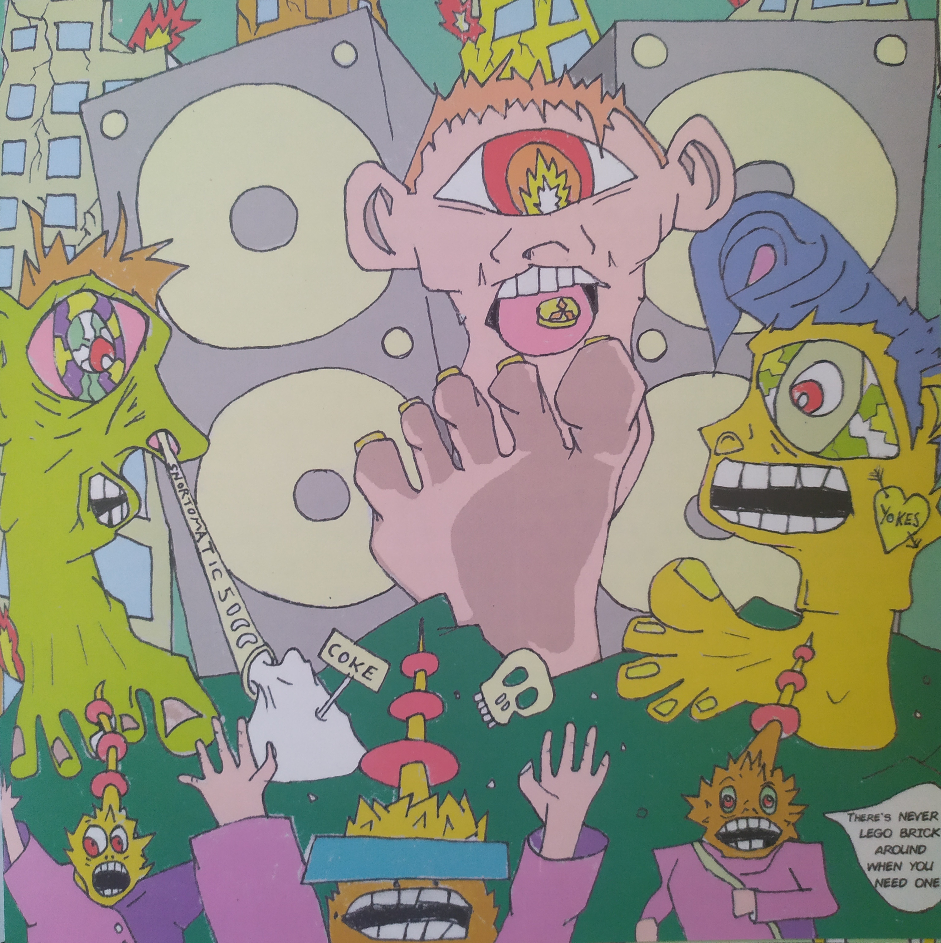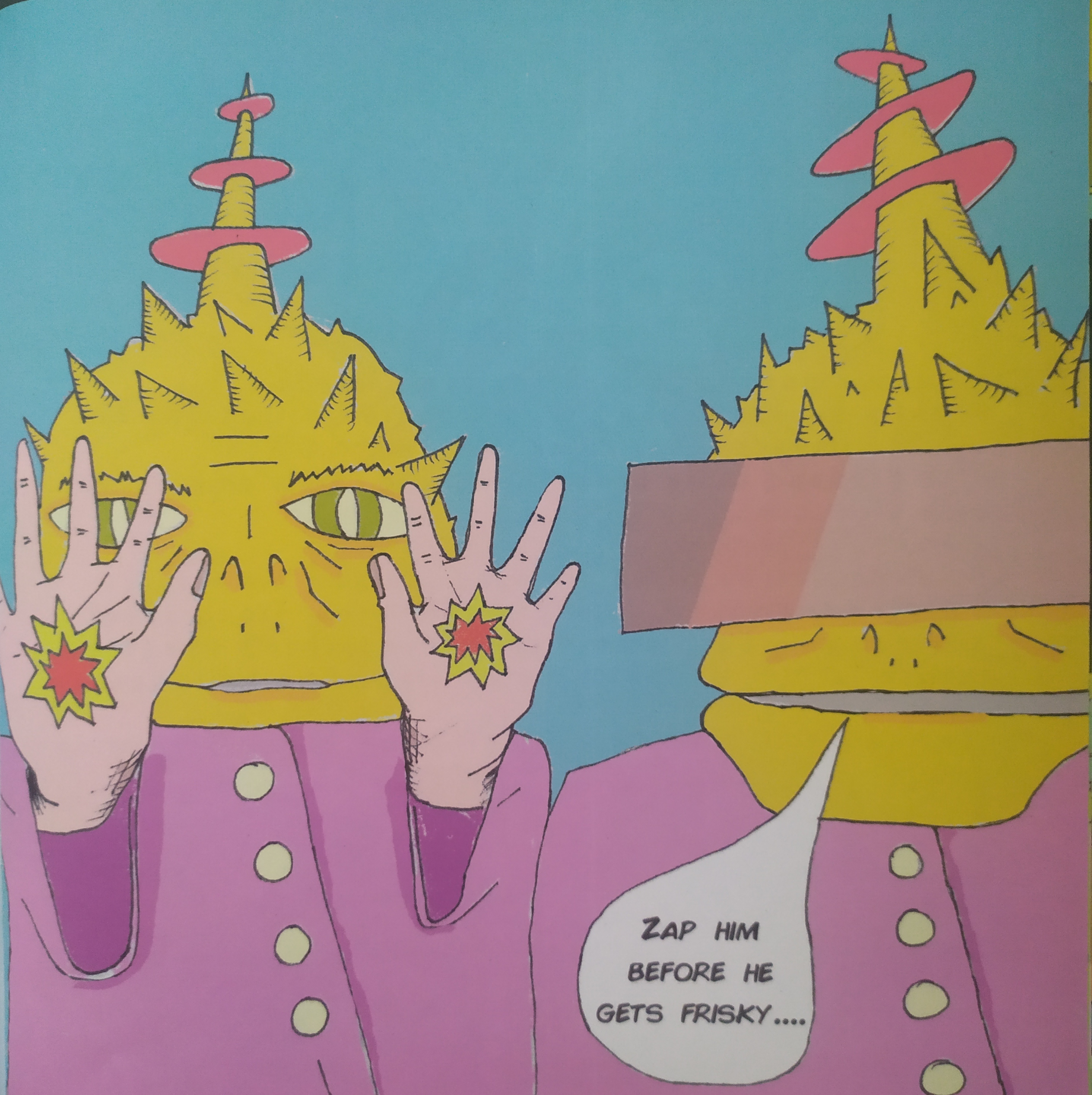 By some meta twist, Brontis himself appears in the comic playing the Take Me Seriously tunes live in a shopping mall, hiding behind analogue synths playing “cod techno, eventually enveloped in a swamp of detuned unease”, much to the apathy of the above-mentioned sparse audience. Track titles are embedded throughout the comic, so in one scene two stragglers spill out of a ‘Popular Frozen Food Chain’ to the sound of mid-tempo nervy acid, and so on.